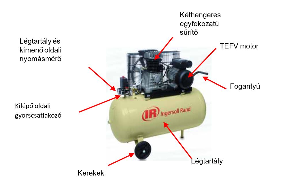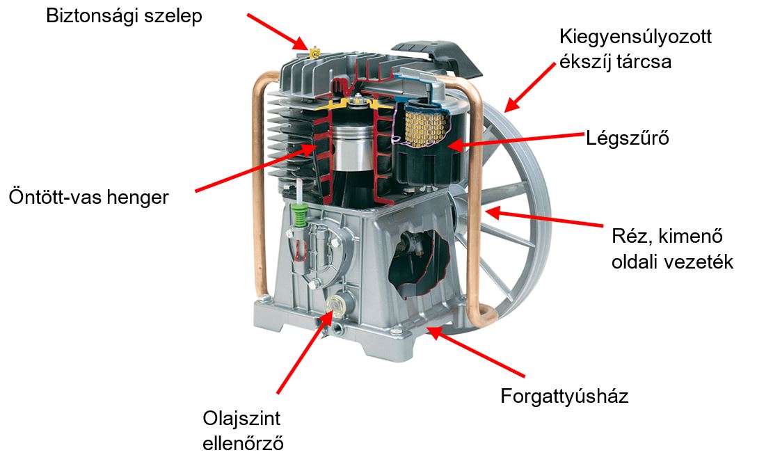 A dugattyús kompresszorok felépítése Minden kompresszor az alábbi kulcsfontosságú alkatrészeket tartalmazza: |